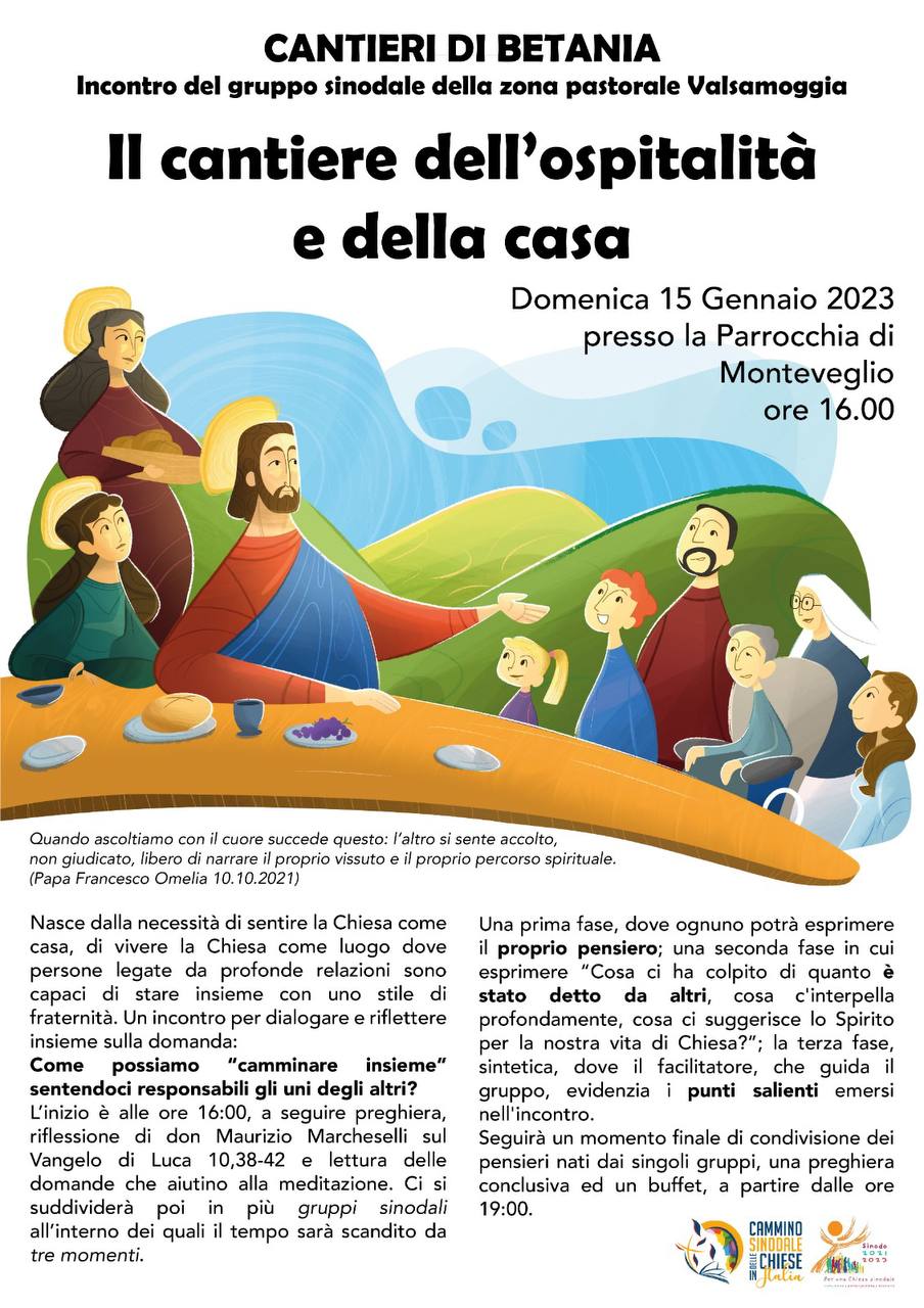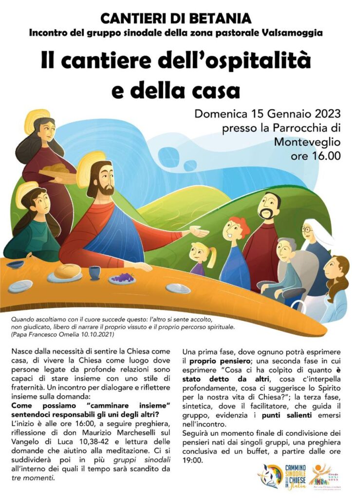 Incontro sinodale sul tema “Cantieri di Betania: il cantiere dell’ospitalità e della casa” presso la Chiesa Parrocchiale di Monteveglio. Dopo la riflessione di Don Maurizio Marcheselli e la meditazione personale ci sarà la condivisione a gruppi. Al termine buffet condiviso.